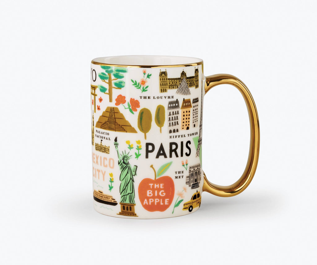 Bon Voyage! Travel the world without leaving home with our travel-inspired mug featuring our favorite sights and cities. Our porcelain mugs feature illustrated designs and a gilded rim and handle to add a little something special to your favorite beverage.