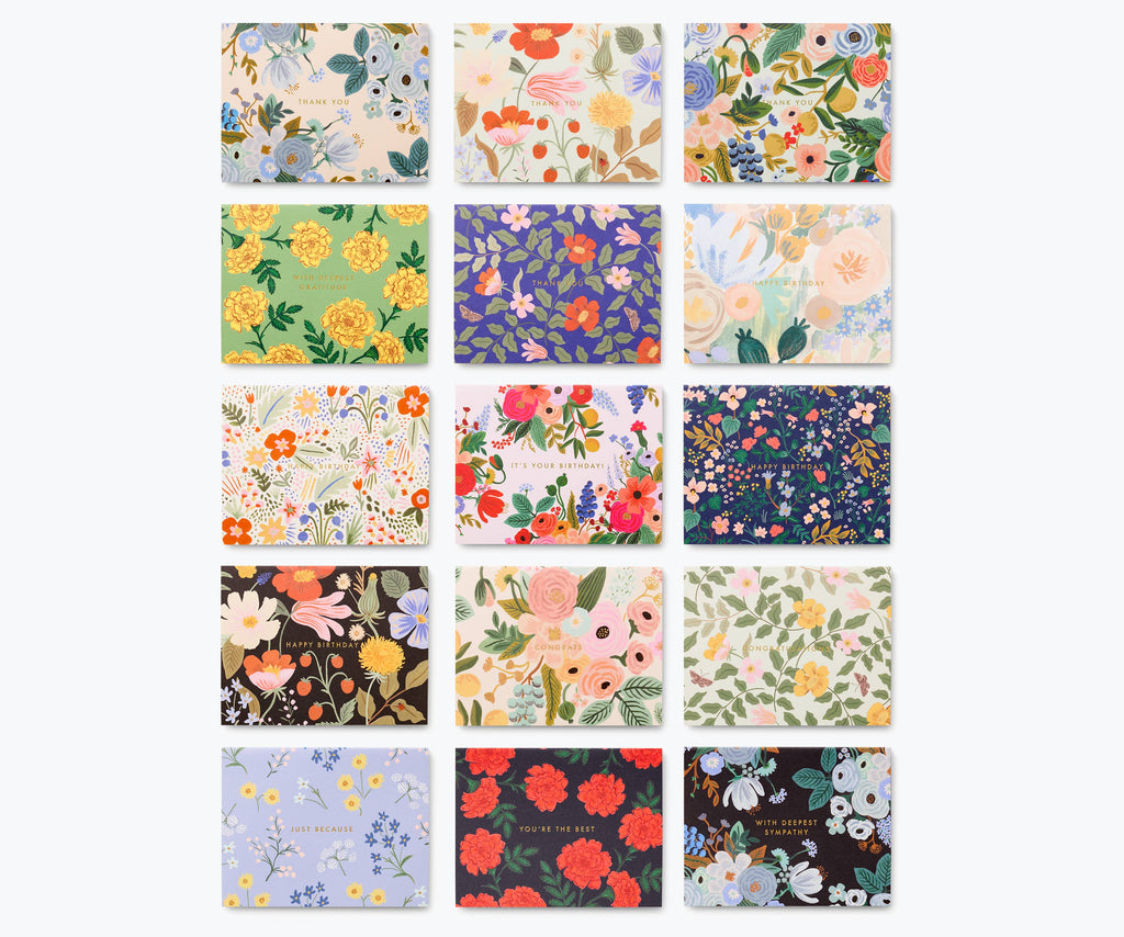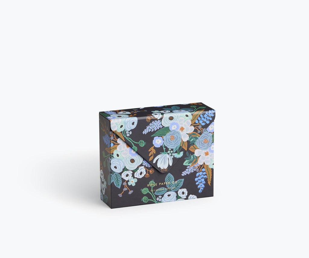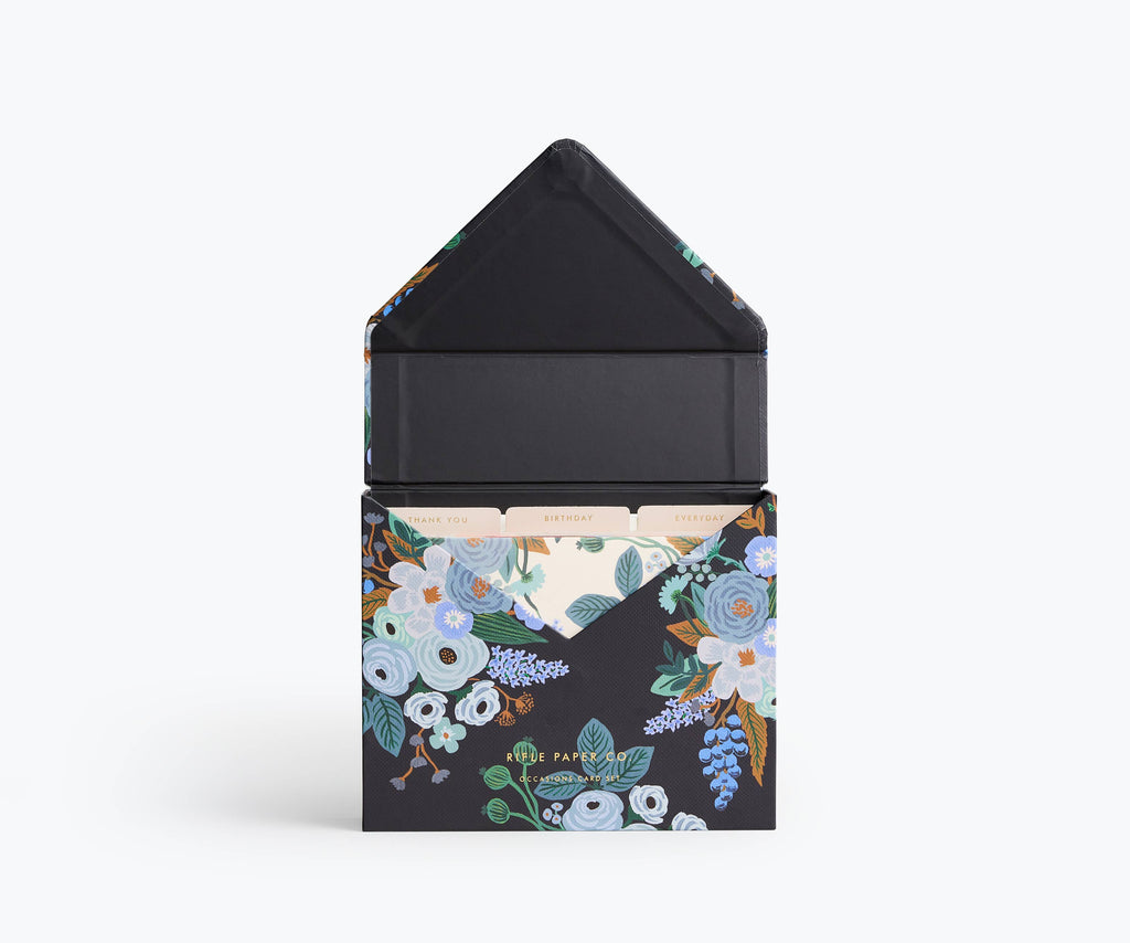 The essentials card box has a greeting card for every occasion. The box is printed with our Garden Party Blue pattern and gold foil accents, and features a magnetic closure. There are 15 A2 cards in the set for birthdays, thank yous, and more, plus foil-stamped dividers to keep them organized. When you're finished with these cards, refill your box with any of our other A2 cards to always have a greeting on hand.